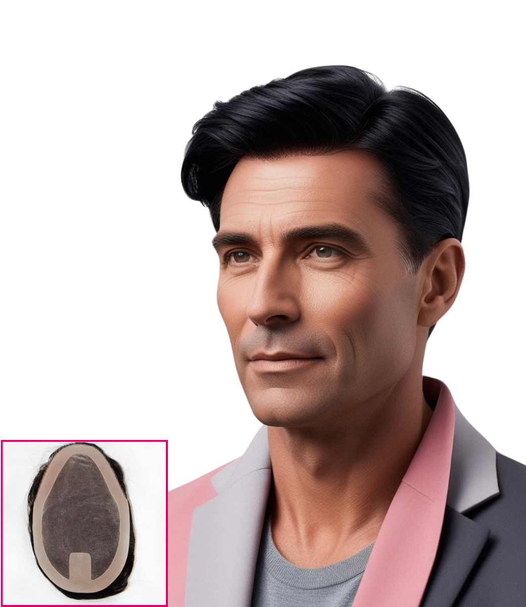 Prótesis capilar para hombre, de pelo 100% natural picada a mano con una raya difuminada y natural en el lado izquierdo. Este sistema está disponible en varios tamaños y colores, tanto colores base como canosos. Sujeción con adhesivo.